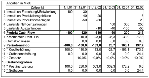 Tab 1 Beispiel Vollständiger Finanzplan Der positive Endwert von 2100 € (Zeile 18) in t=5 zeigt, dass die Handlungsmöglichkeit vorteilhaft ist, weil alle Auszahlungen geleistet wurden und trotzdem noch ein Guthaben zur Entnahme vorhanden ist Das Vermögen des Investors hat sich erhöht. Beispiel für einen Vollständigen Finanzplan t 0 t 1 t 2 t 3 t 4 t 5 Direkte Zahlungen a 01 0 ü t 250 250 250 R n 1000 indirekte Zahlungen Kreditaufnahme 500 Eigenkapital 500 Zinsen 50 50 50 50 50 Tilgung Reinvestition t 12 0 Habenzins (5%) 10 Rückzahlung 0 Reinvestition t 2410 Habenzins (5%) 21 Rückzahlung 410. Ein vollständiger Finanzplan mit hohem Konkretisierungsgrad ist hinsichtlich der Eigenkapitaldispositionen (Bestand an eigenen Mitteln, Einlagen, Entnahmen, Ausschüttungen, Subventionen, ua) und der Fremdkapitaldispositionen 11 (Kreditaufnahmen, Tilgung, Zinsaufwand, ua) sehr ausführlich aufgebaut.