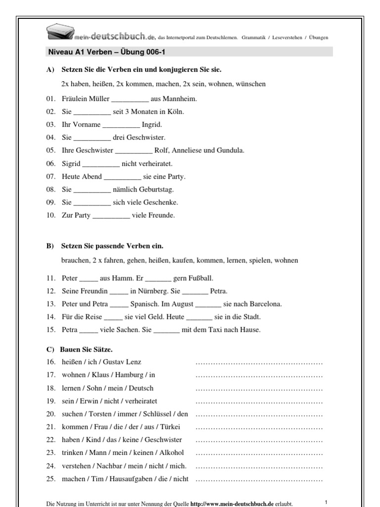 Niveau A1 Verben Ubung 006 1 A Setzen Sie Die Verben Ein Und