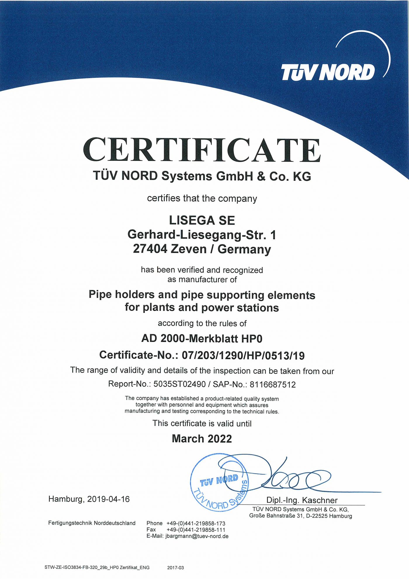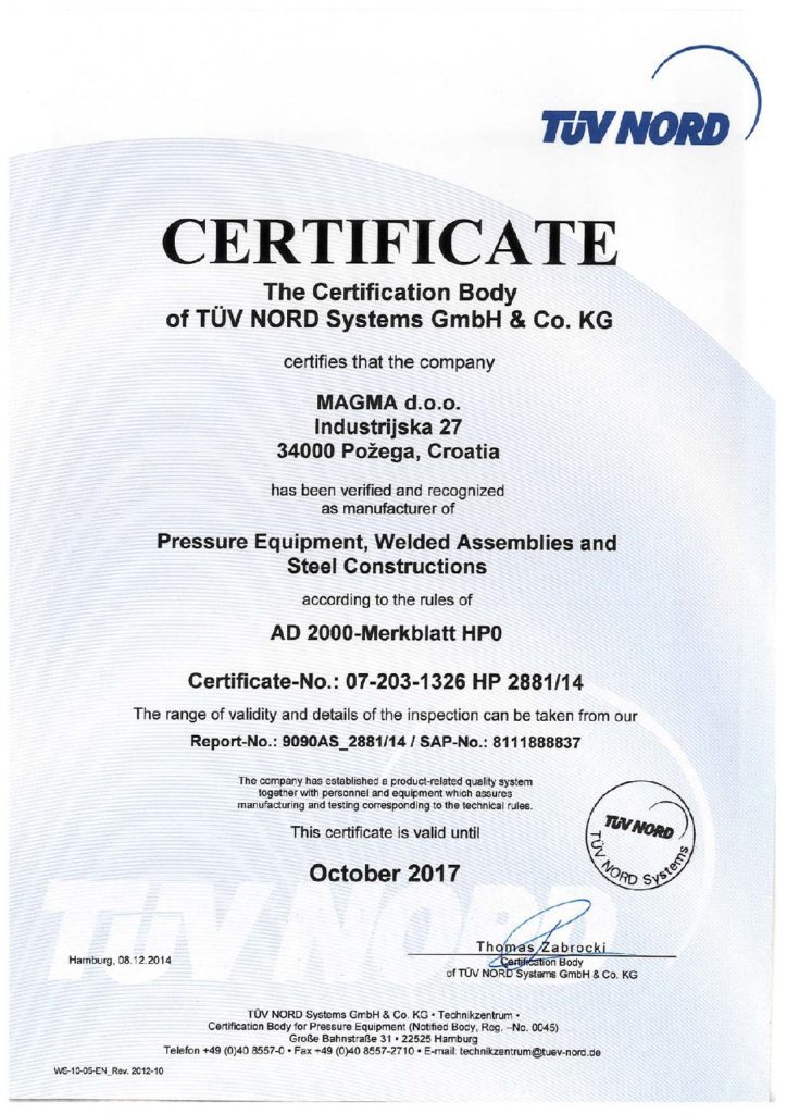 STWZEISO34F_29b_HP0 Zertifikat_ENG 1703 CERTIFICATE TÜV NORD Systems GmbH & Co KG certifies that the company GESTRA AG Armaturen u elektromechanische Fertigung Münchener Str 77 215 Bremen / Germany has been verified and recognized as manufacturer of Valves and accessories according to the rules of. This is the first AD00Merklbatt HP0 certificate issued in India by DNV GL Rotterdam Industries relying on welding as a key process in manufacturing, looking to improve their welding quality system and operation control can significantly benefit from the AD00Merkblatt HP0/ ISO 34 certification.