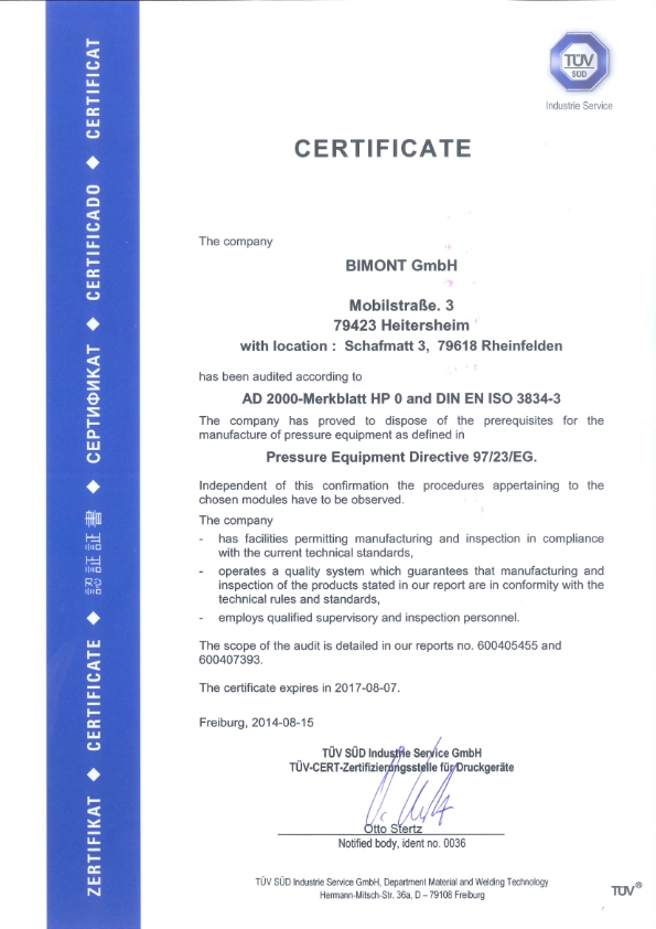 PED 97/23/EC AnnexI, 43 / AD 00 W0 Material Manufacturer Approval and AD 00 HP0 / ISO 34 Equipment / Welding Workshop Approval The PED Pressure Equipment Directive was adopted by the European Parliament and the European Council in May 1997 and from 29 May 02 has been obligatory throughout the European Union with penalties for non. Certified Management Systems AD 00 HP0 and EN ISO Certificate Holder Pentair Valves & Controls Netherlands BV Test Mark Number. Kvalitu provedených svářečských prací u výroby tlakových nádob dokládáme Certifikát AD 00 – Merkblatt HP 0, TRD 1 Certifikát EN ISO 34 – 2 Certifikát AD 00 – Merkblatt HP0, TRD 1 Číslo certifikátu TÜV SÜDDG PLATNOST 07/ do 03/23 CERTIFIKAČNÍ ORGÁN TÜV SÜD Industrie Service GmbH ROZSAH CERTIFIKACE Ověření systému jakosti pro.