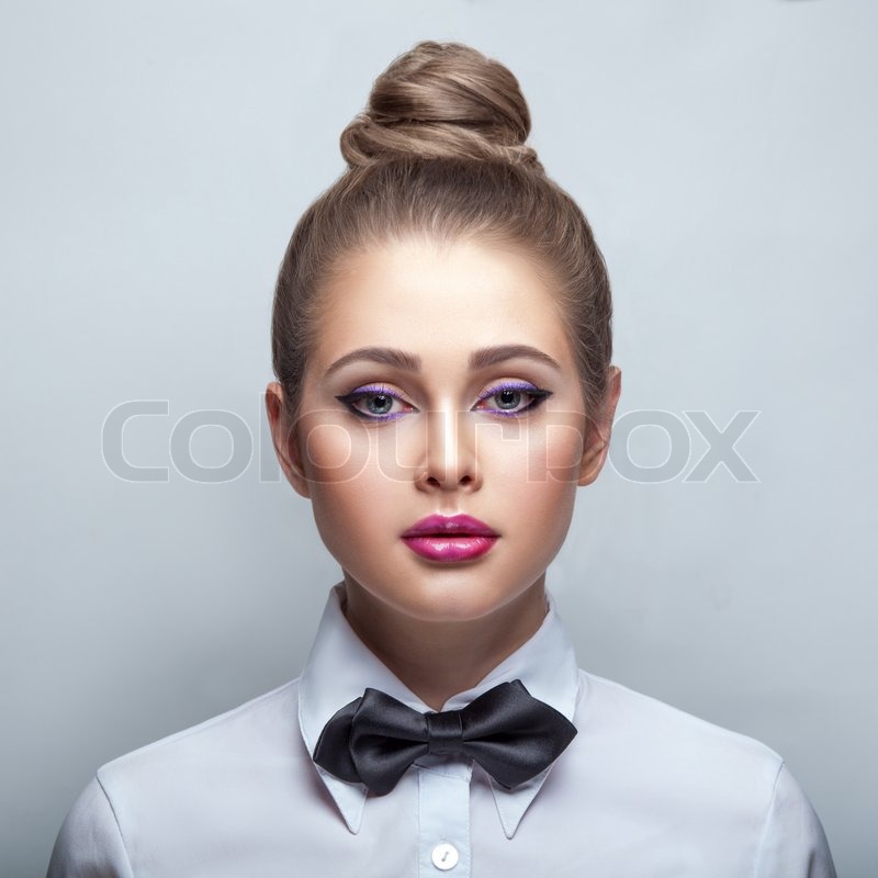 Modische Junge Leeren Ausdruck Lockiges Haar Weisses Hemd Fliege Etwas Lustig Lizenzfreie Fotos Bilder Und Stock Fotografie Image