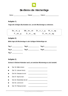 Mit unserer Hilfe ist es sehr einfach die Wochentage auf Englisch mit Aussprache zu lernen sowie auch die Abkürzungen und wie müssen Sie es in eine Gespräch richtig benutzen Wie auf Deutsch, die Wochentagen in Englisch sind mit einem Großbuchstaben geschrieben bei anfang und sind in zwei Kategorien aufgeteilt Werktags und Wochenende Beachten Sie, dass "days of the week" sind alle sieben. Arbeitsblätter zum Ausdrucken von sofatutorcom Wochentage, Monate und Jahreszeiten 1 Nenne die Wochentage auf Englisch 2 Ergänze die Sätze mit den unten stehenden Begri en 3 Bestimme die passende Jahreszeit 4 Finde die richtige Jahreszeit heraus 5 Ordne die Wörter richtig an 6 Bestimme, welches Wort in die Lücke passt mit vielen Tipps, Lösungsschlüsseln und Lösungswegen zu. Wochentage Galgenraten englische Vokabeln im Internet AufgabenNr 28In diesem Spiel sind englische Wörter zum Thema Wochentage versteckt Klicke unten auf die Buchstaben.