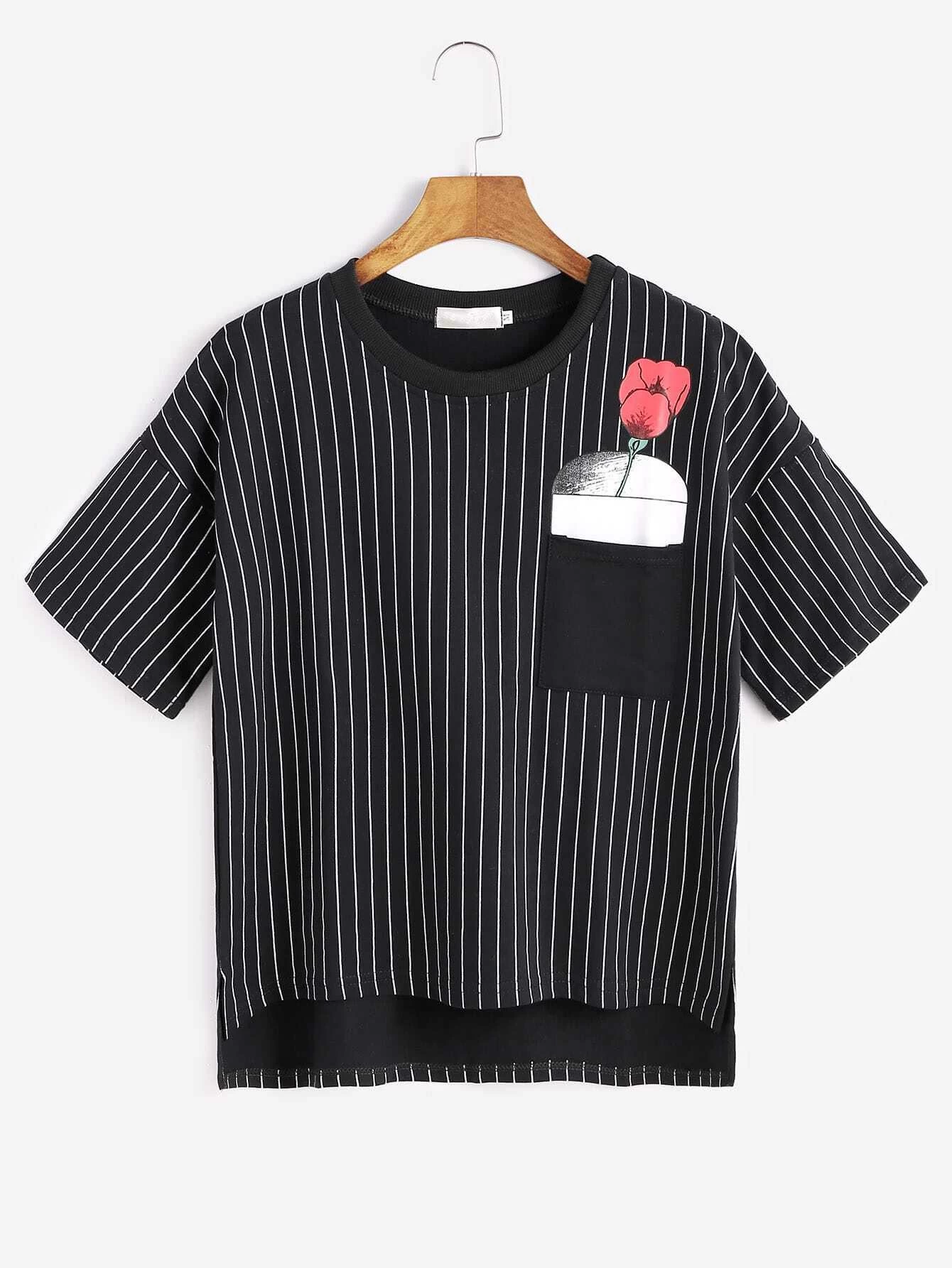 T Shirt Mit Vertikaln Streifen Rose Druck Taschen Vorne Kurz Hinten Lang Schwarz Romwe