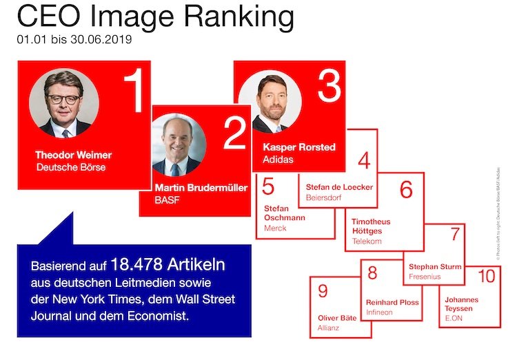 The CEO Ranking is based on data from around 19,000 reports published in Germany’s leading media in the first half of the year, with UNICEPTA Medienanalyse GmbH drawing on the findings of its.