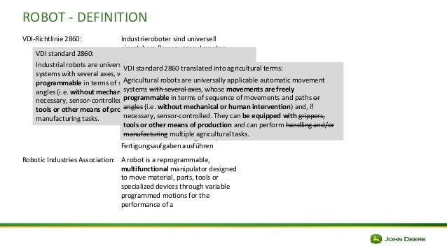 Begriffe, Definitionen, Symbole Verein Deutscher Ingenieure, Düsseldorf, Germany, (1990) Cited by Citation Added To Cart This paper has been added to your cart To Shop To. VDI (Richtlinie 2860) Industrieroboter sind universell einsetzbare Bewegungsautomaten mit mehreren Achsen, deren Bewegungen hinsichtlich Bewegungsfolge und Wegen bzw Winkeln frei (dh ohne mechanischen Eingriff) programmierbar und gegebenenfalls sensor geführt sind Sie sind mit Greifern, Werkzeugen oder anderen Fertigungsmitteln ausrüstbar. Die Geometrie wird dafür mit einer intuitiven Verhaltensbeschreibung entsprechend VDIRichtlinie 2860 kombiniert und so dynamisiert Die Methode ist in den VIBNEngineeringAblauf integriert, nutzt weit verbreitete EngineeringWerkzeuge und AutomationML als Beschreibungsmittel.