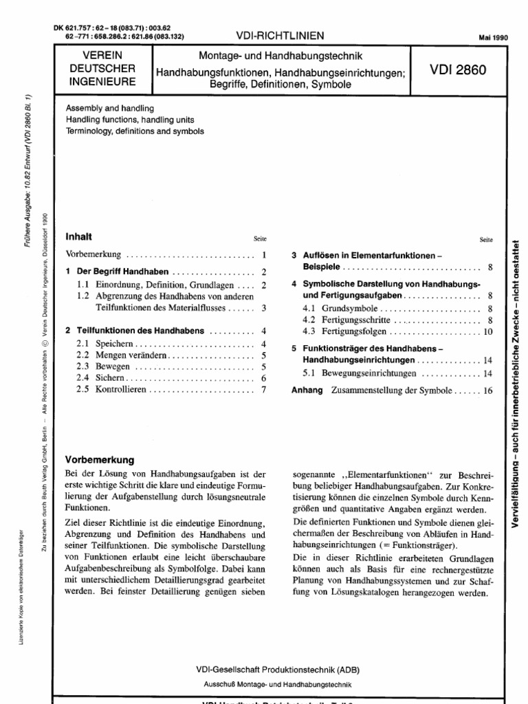 VDI 2860 Montage und Handhabungstechnik;. VDI 2860 Blatt 1 VDI 2860 Blatt 1 Zurückgezogen Montage und Handhabungstechnik Handhabungsfunktionen, Handhabungseinrichtungen, Begriffe, Definitionen, Symbole Auf einen Blick Englischer Titel Assembly and handling units Handling functions, handling units, terminology, definitions and symbols. Allgemeines Um nach Normen zu recherchieren, nutzen Sie spezielle Datenbanken, die Normen verzeichnen – teilweise im Volltext Sie finden eine Übersicht aller von der KITBibliothek lizenzierten bzw frei verfügbaren Datenbanken zu Normen im DatenbankInfosystem DBIS (Zugang über KIT, HsKA bzwDHBWKA).