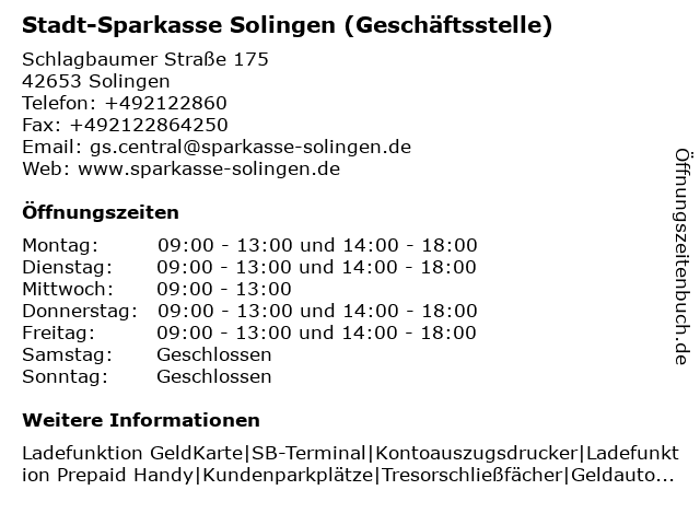 0212 2860 Mo Fr von 800 1900 Uhr Keine Wege, schnelle Abwicklung, längere Erreichbarkeit Bei der StadtSparkasse Solingen können Sie zahlreiche Leistungen rund um Ihr Konto auch einfach per Telefon abwickeln. StadtSparkasse Solingen (Burg) Schloßbergstraße, 1 Solingen Phone 49 212 2860 Fax 49 212 Email gsburg@sparkassesolingende StadtSparkasse Solingen (Central) Schlagbaumer Straße, 175 Solingen. Hier finden Sie die Öffnungszeiten und Ausstattungsmerkmale der StadtSparkasse Solingen, Geschäftsstelle Central Schlagbaumer Str 175 in Solingen.