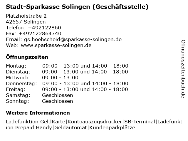 ᐅ Offnungszeiten Stadt Sparkasse Solingen Geschaftsstelle Hohscheid Platzhofstr 1 In Solingen