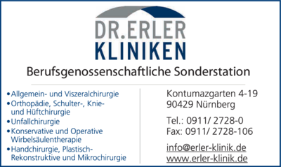 Die KLINIKEN DR ERLER gGmbH ist Träger eines leistungsfähigen Fachkrankenhauses mit 244 operativen Betten im Zentrum der Stadt Nürnberg In den Kliniken und Abteilungen für Orthopädie. Schwerpunkt Knochenbruch des Unterarmes. Erler KlinikBewertungen für Kliniken Dr Erler Handchirurgie, Kontumazgarten 418, Nürnberg Patienten berichten ihre Erfahrungen und bewerten die Klinik Unfallchirurgie Kliniken Dr Die Klinik für Orthopädie ist seit 13 als Endoprothetikzentrum der Maximalversorgung zertifiziert.