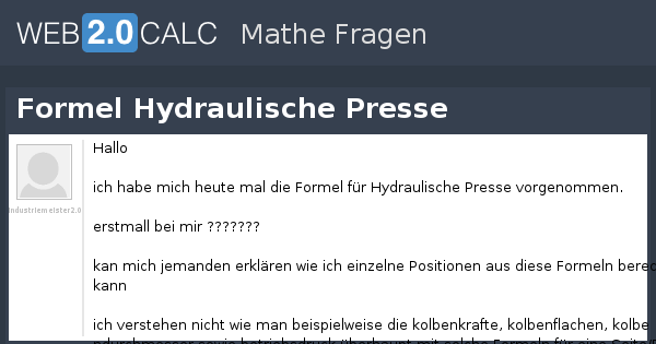 Hydraulische presse erklarung. Der Redaktionsausschuss und die Chefredaktion der „Presse“ verwahren sich gegen den Versuch mehrerer Oberstaatsanwälte der WKStA, eine „Presse“Re. Um einen PneumatikSchaltplan oder einen HydraulikPlan zu zeichnen, benötigt man entsprechende Schaltzeichen Die Bedeutung der Schaltzeichen in einem Fließplan ist hier beschrieben. Hydraulische Presse In einer hydraulischen Presse wird das Prinzip der kommunizierenden Röhren als Grundlage zur Arbeitsverrichtung genutzt (Abbildung Hydraulische Presse) Hierbei werden zwei Zylinder mit deutlich unterschiedlichen Querschnitten eingesetzt Auf den Arbeitszylinder mit dem kleinen Querschnitt wird hierbei eine Kraft ausgeübt.
