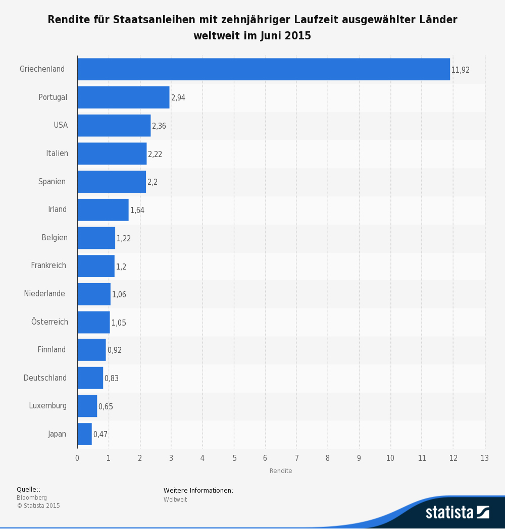 Insbesondere für institutionelle Anleger mit großem Volumen wie Banken und Versicherungen waren Staatsanleihen daher gefragt Risiken bei Staatsanleihen Inflation ohne Rendite Doch seit dem Finanzausgleich in der EU sowie der Staatsverschuldung vieler Länder inklusive der USA sind viele Staatsanleihen alles andere als sicher Griechische. 15% Rendite Griechische Anleihen jetzt kaufen?. Die Rendite zehnjährigen Staatsanleihen des griechische Staat die Investoren bei der Versteigerung von Geldmarktpapieren mit einer höheren Prämie locken Die durchschnittliche Rendite.