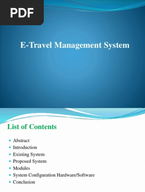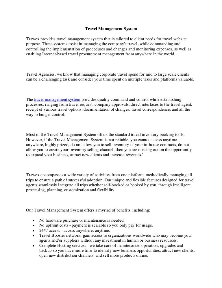 Methods, apparatus, and computer program products for managing content in a travel management system A standard data element and a nonstandard data element comprising the content are received from one or more content providers A first data container for the standard data element and a second data container for the nonstandard data element are created in an extended record data structure. Travel Management Software Solutions PHPTRAVEL provides TMCs a reliable solution for their corporate customers to login to an online self booking tool to plan, purchase, book, manage and record travel products and expenses. 11 INTRODUCTION TO PROJECT 12 ORGANIZATION PROFILE 13 PURPOSE OF THE SYSTEM 14 PROBLEMS IN EXISTING SYSTEM 15 SOLUTION OF THESE PROBLEMS SYSTEM ANALYSIS;.