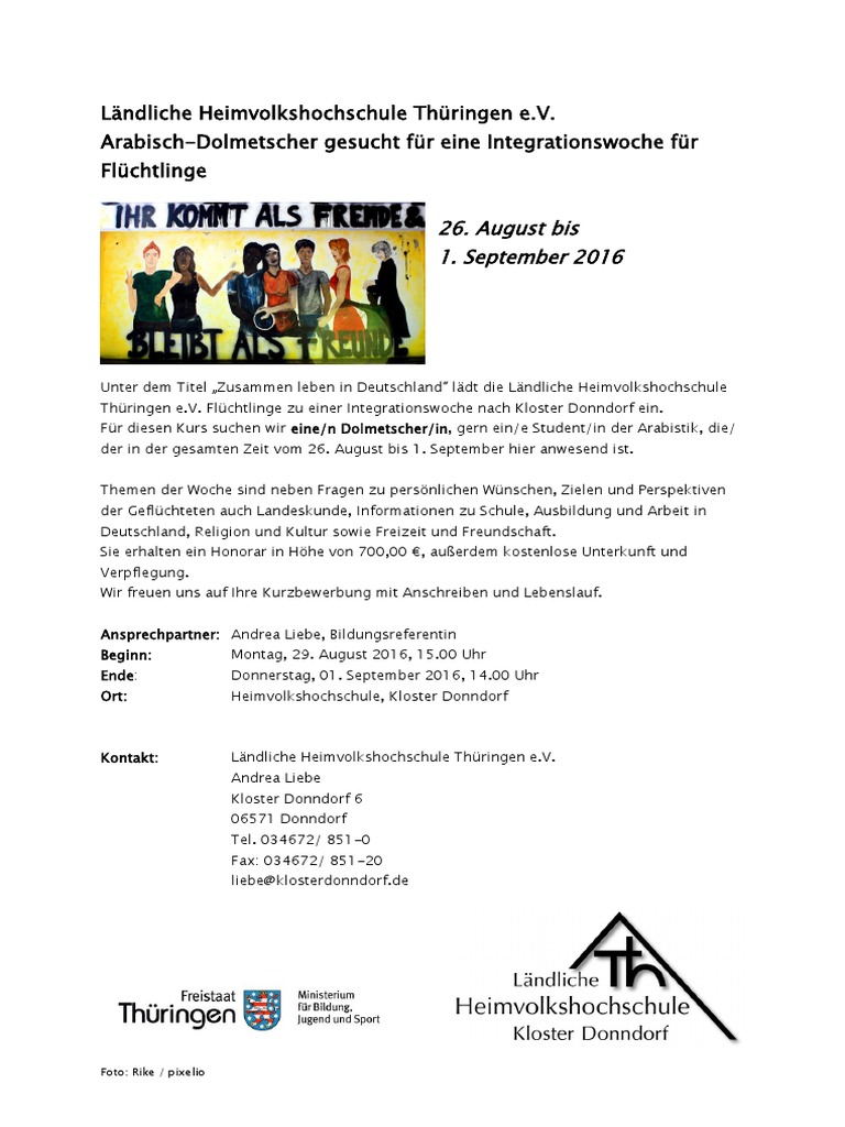 Landliche Heimvolkshochschule Thuringen E V Arabisch Dolmetscher Gesucht Fur Eine Integrationswoche Fur Fluchtlinge
