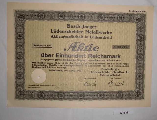100 Reichsmark Aktie Busch Jaeger Ludenscheider Metallwerke Ag Mai 1933 Ebay