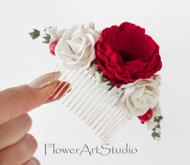Red And White Flower Comb Cottage Shic Bridal Headpiece Romantic Bridal Comb Red And White Bridal Hair Flower Rustic Style Hair Comb Weddbook