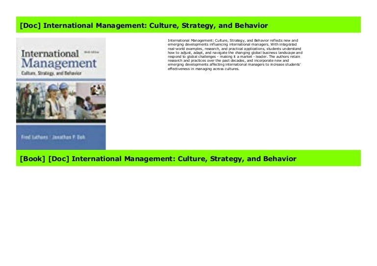 International Management Culture, Strategy, and Behavior reflect new and emerging developments influencing international managers With integrated realworld examples, research, and practical applications, students understand how to adjust, adapt, and navigate the changing global business landscape and respond to global challengesmaking it a marketleader. It is therefore important for any international management student to understand culture to better prepare for dealing with such tensions According to Geert Hofstede, Geert Hofstede, “ Culture’s consequences Comparing values, behaviors and institutions across nations ,” 2nd edition, 01, Thousand Oaks, CA Sage Publications. A fundamental implication of the work of Hofstede, Hampden‐Turner and Trompenaars, and other contributors to the developing body of experience and knowledge about international culture and management is that cultural interpretation and adaptation are a prerequisite to the comparative understanding of national and international management practice.