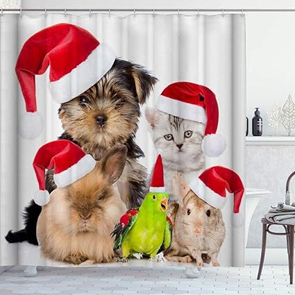 Dycbness Duschvorhang Der Hund Katze Maus Kaninchen Und Vogel Tragen Den Weihnachtshut Auf Weissem Hintergrund Langhaltig Hochwertig Bad Vorhang Polyester Stoff Wasserdichtes Design Mit Haken 180x180cm Amazon De Kuche Haushalt