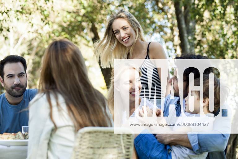 Happy Friends And Family Having Lunch In Garden With Red Wine Zef Zerocreatives Westend61