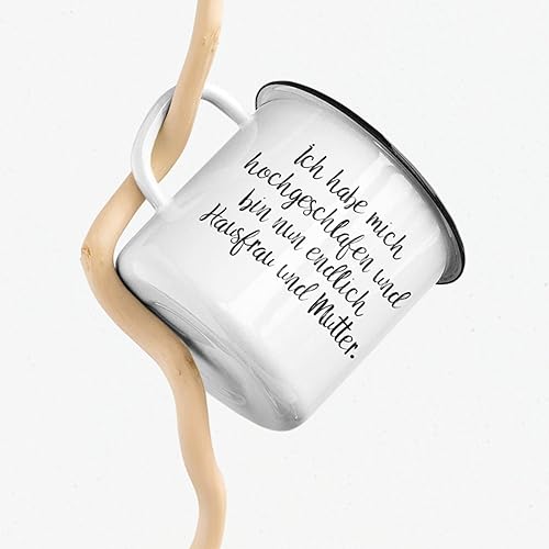 Emaille Tasse Humor Ich Habe Mich Hochgeschlafen Und Bin Jetzt Hausfrau Und Mutter Liebe Deko Geschenk Kaffee Tee Tasse Design Schwarzer Humor Amazon De Handmade