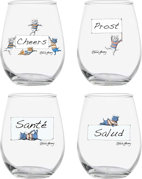Amazon De Edward Gorey Cats Stiellose Weinglaser Set Mit 4 Illustrierten Glasern Say Cheers Salud Prost Sante