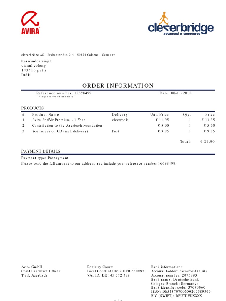 My Avira Account is a single, easytouse & secure web console to manage your account, all your devices (including PC, Mac, Android or iPhone) and the 10 cleverbridge Kündigungsadresse und Kontaktdaten – Aboalarm. Systweak / Cleverbridge Deu unrecognised credit card. Cleverbridge ist als ECommerce Partner von Avira für den Bestellprozess und die Zahlungsabwicklung im Avira OnlineShop verantwortlich Beim Kauf einer Avira Software oder Verlängerung eines bestehenden Abonnements, erhalten Sie von Cleverbridge eine BestätigungEMail, die alle Bestellinformationen beinhaltet.