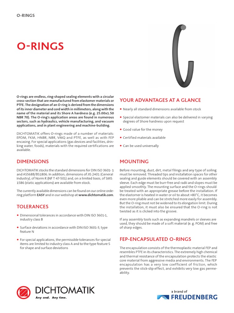 No matter if you require a Simmerring, oring, rod seal or another solution, we have the right component available for you Via our eCatalog you can find premium seals from Freudenberg Sealing Technologies for highest requirements and maximum reliability as well as standard industry solutions from Dichtomatik. Dichtomatik STU type backup rings are now available from stock in all standard dimensions to match our Orings If you need assistance in selecting the right Oring/Backup ring combination, please contact us Organizational merger Hungary As of June 1st, Dichtomatik Kft and Freudenberg Sealing Technologies Kft merged in Hungary. DICHTOMATIK ORING HANDBOOK 134 ELASTOMER TYPE DETAILS Details are provided here for some of the more common oring sealing elastomers General descriptions are provided in the text Additional details on several of the elastomers are provided in the tables Further information regarding.