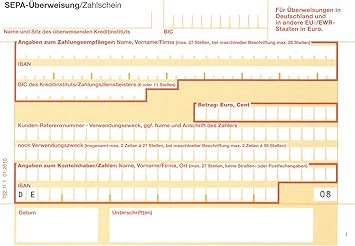 Sepa ueberweisung am pc ausfuellen und drucken kaufen Die wichtigsten Kaufkriterien im Überblick bei Uns Hier findest du die wichtigsten Kaufkriterien im Überblick Du solltest dich vor allem nicht nur anhand des Preises eines sepa ueberweisung am pc ausfuellen und drucken entscheiden, denn dieser sagt leider nichts über die Qualität des. Wir erklären Ihnen, wie Sie eine Quittung richtig ausstellen und welche Pflichtangaben Sie auf keinen Fall vergessen dürfen. Füllen Sie im Formular wie bei einer InlandsÜberweisung alle Eingabefelder aus, die nicht als optional gekennzeichnet sind Sie haben die Möglichkeit, unterschiedliche Entgeltregelungen auszuwählen Grundsätzlich ist in der Auswahlliste die Entgeltteilung vorausgewählt Sofern Sie eine abweichende Regelung festlegen möchten, klicken Sie.