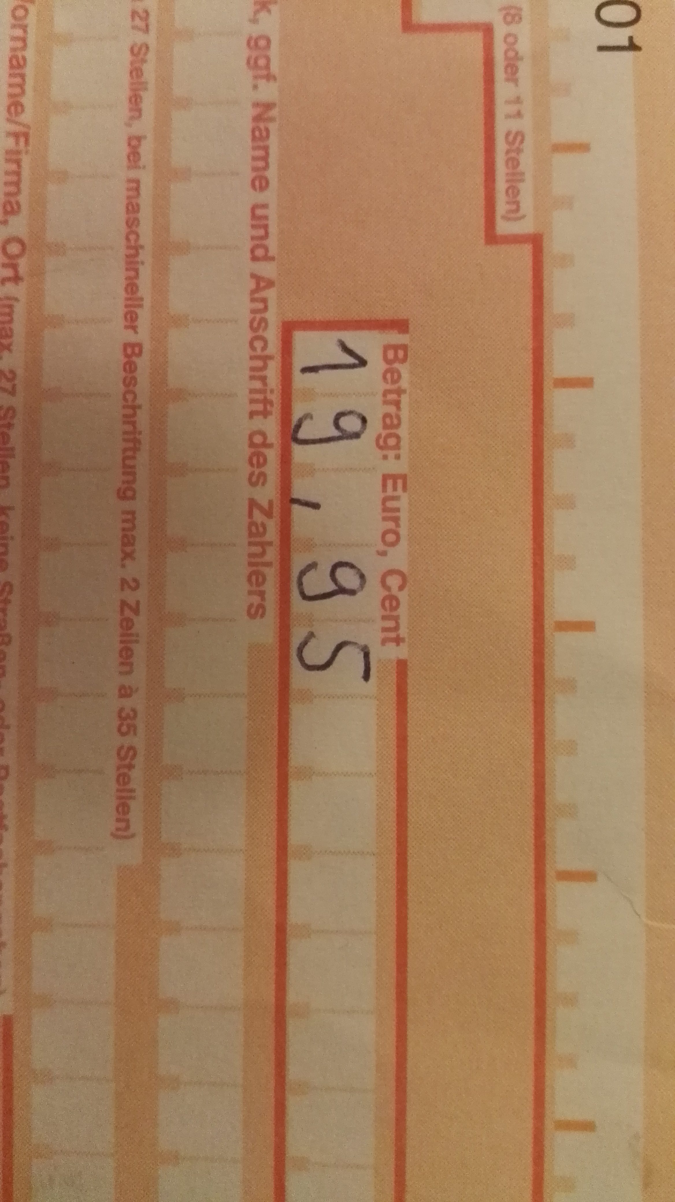 Als Erst oder Folgeverordnung durch den niedergelassenen Arzt idR bis zu 28 en;. Wenn Sie einen Zahlschein ausfüllen und eine Überweisung vornehmen möchten, schauen Sie sich den Zahlschein genau an Voraussetzung ist, dass Sie eine Überweisung innerhalb Deutschlands tätigen wollen Jeder Zahlschein hat gewisse Eigenheiten Verwenden Sie am besten einen schwarz schreibenden Kugelschreiber, da schwarze Tinte am besten gelesen werden kann. Für eine Überweisung müssen Sie die folgenden Eingabefelder ausfüllen Auftraggeberkonto (Von) Hier können Sie eines Ihrer zum Online Banking angemeldeten Konten auswählen, mit dem der Auftrag ausgeführt werden soll Empfängername (An) Geben Sie in dieses Feld den Namen oder die Firma des Empfängers ein Dafür stehen Ihnen 70 Zeichen zur Verfügung.