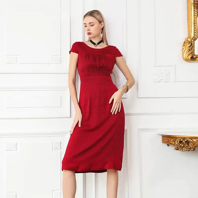 Voa Seide Jacquard Burgunder Hohe Taille Tunika Buro Damen Arbeiten Eine Linie Kleid Frauen Sommer Midi Kleider Dunne Kleidung Vestido A815 Kleider Aliexpress