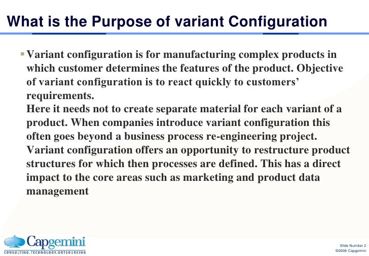Variant configuration is for manufacturing complex products. Introduction Welcome to the Saptutorials, Today we will take close look at Variant Configurationits a tool that simplifies the complex manufacturing process when the manufacturer is having a various specification of same product products E,g, CarCar price started with standard equipment, Now if want to buy any specific feature that will cost higher than the car base priceSAP Variant. Variant configuration is for manufacturing complex products The manufacturer is always having to offer new variants of its products Often, new variants are created by modifying existing product designs as you process the order The important thing is to react quickly to customers' requirements The customer determines the features of the product.