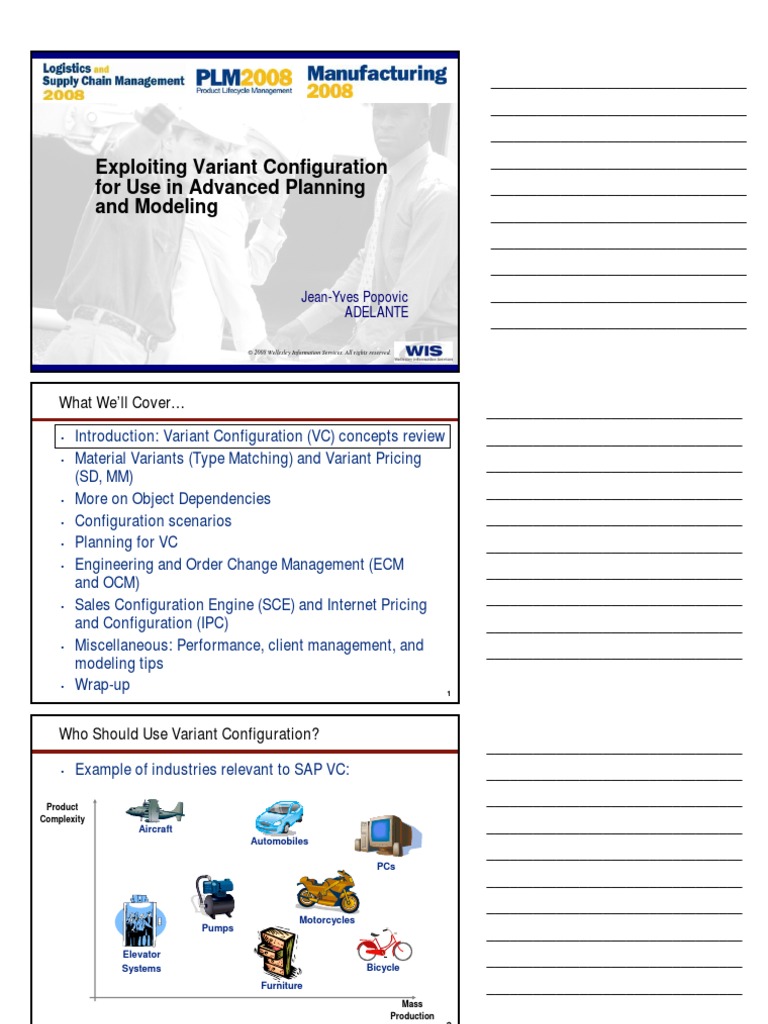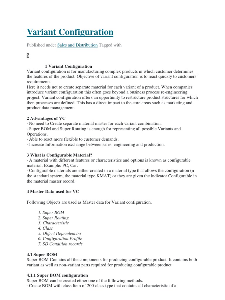 With variant configuration, the customer or a salesperson can also determine features of a product, collect and document specifications for the product and ensure that the product can be produced with those specifications while productions costs are automatically calculated The product configuration also improves information exchange between sales, engineering, and production. The SAP ME HowToGuide for Variant Configuration is intended to provide sufficient information to describe the setup, flow and processing of a configurable material, BOM and Routing and Production Orders sent from ERP to ME 12 Scope. This document covers the best practices followed during implementation of the SAP Variant Configuration projects in various industries 1 Easy Naming Convention In hitech manufacturing company, it has always been a challenge to maintain the Variant configuration (VC) Master Data.
