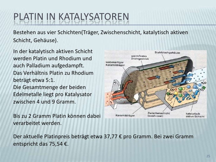 Katalysatoren enthalten Platin, Rhodium und Palladium In Katalysatoren gibt es jedoch kein Gold Der Gehalt variiert je nach Fahrzeugmodell stark, aber im Durchschnitt liegt das Keramikgewicht bei ca knapp 1 kg und der Edelmetallgehalt zwischen 0,2% und 0,5%. Bei der Verbrennung von Treibstoff im Zylinder eines Motors entstehen Auspuffgase, die Umweltschadstoffe enthalten Um den Ausstoß der im Abgas enthaltenen Schadstoffe zu verringern, werden Katalysatoren eingesetztDer Katalysator ist in den Auspuff eines Fahrzeugs eingebaut Er besteht aus einem Keramikkörper, der von einem Blechmantel umgeben ist. Edelmetalle im klassischen Sinn Zu den Edelmetallen im klassischen Sinn gehören Gold, Silber und die Platinmetalle Teilweise wird auch noch Quecksilber zu den Edelmetallen gezählt, obwohl es in vieler Hinsicht reaktiver als die anderen Edelmetalle ist Edelmetalle korrodieren bei Raumtemperatur an Luft entweder gar nicht oder nur äußerst langsam und in sehr geringem Umfang, so wie Silber.