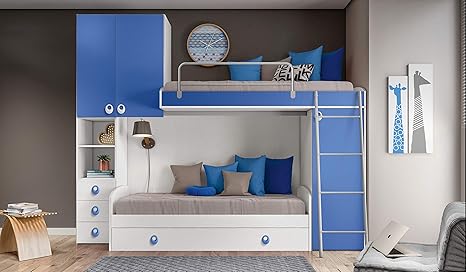 Inhouse Srls Schlafzimmer Bugel Weiss Und Blau Mit Zwei Betten Sofa Und Hochbett Und Integrierter Kleiderschrank Hohe 236 Lange 295 Tiefe 86 5 Amazon De Kuche Haushalt