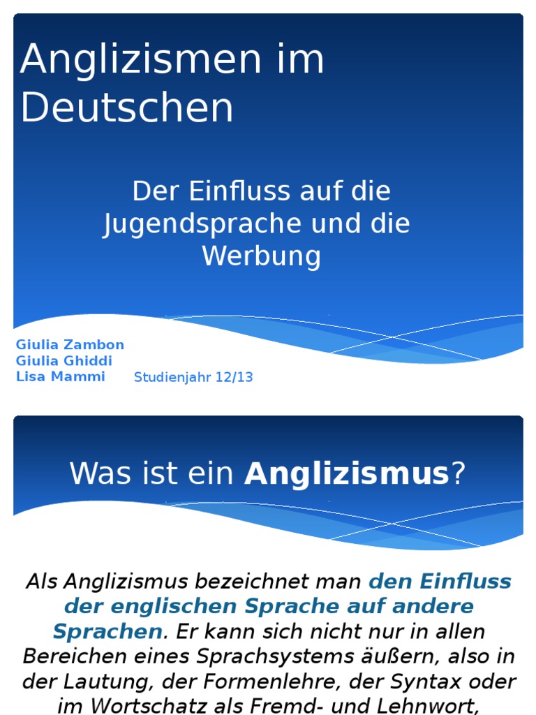In der AnglizismenDebatte der letzten Jahre nimmt Werbung eine besonders exponierte Stellung ein Der Anteil rein englischer Slogans steigt dabei um fast 0 Prozent. Eine Werbebotschaft sollte klar und einprägsam sein Viele Unternehmen setzen auf englische Slogans Die Sache hat einen Haken Die Mehrheit der Deutschen versteht nicht, was die Unternehmen. Werbung bestimmt unser Leben Wir werden jeden mit Werbung konfrontiert In der Werbebranche wird mit englischen Sätzen geworben, da es als „cool“ gilt, die englische Sprache zu sprechen Es zeigte sich jedoch in einer Statistik, dass der Durchschnittsdeutsche darauf nicht anspringt.
