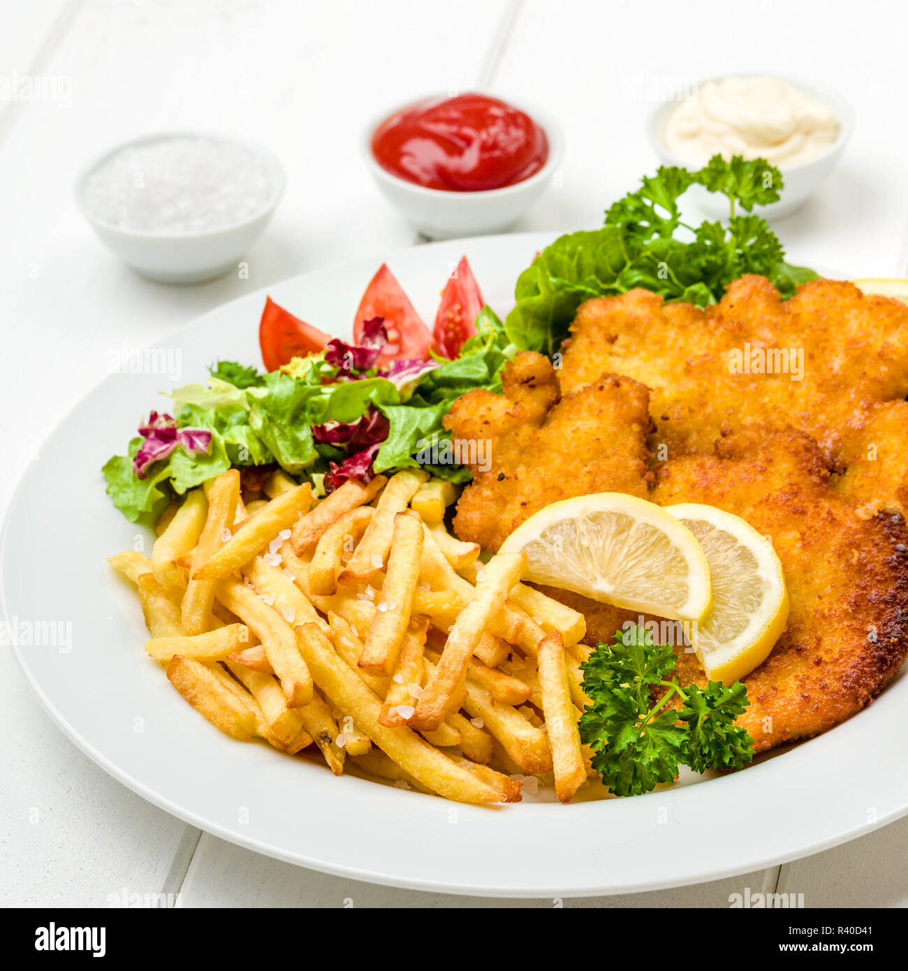 Wiener Schnitzel Mit Pommes Frites Salat Und Einen Scharfen Dip Stockfotografie Alamy
