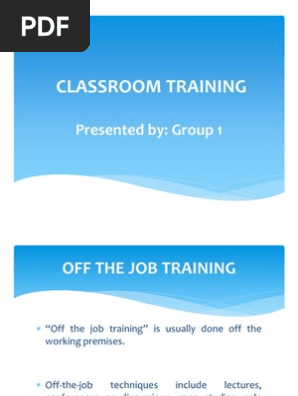 Organizations have different theories about what constitutes a stellar, onthejob training program For instance, some businesses implement “lunch and learn” programs where the business caters lunch and brings in a speaker to give a series of highlevel lectures and workshops to employees. “Off the job” training is a method of training, which is undertaken at a site, away from the actual workplace for a particular period The reason behind imparting training at a place other than the job location is to provide a stressfree environment to the employees where they can concentrate only on learning. Offthejob Methods On the job training methods have their own limitations, and in order to have the overall development of employee’s offthejob training can also be imparted The methods of training which are adopted for the development of employees away from the field of the job are known as offthejob methods.