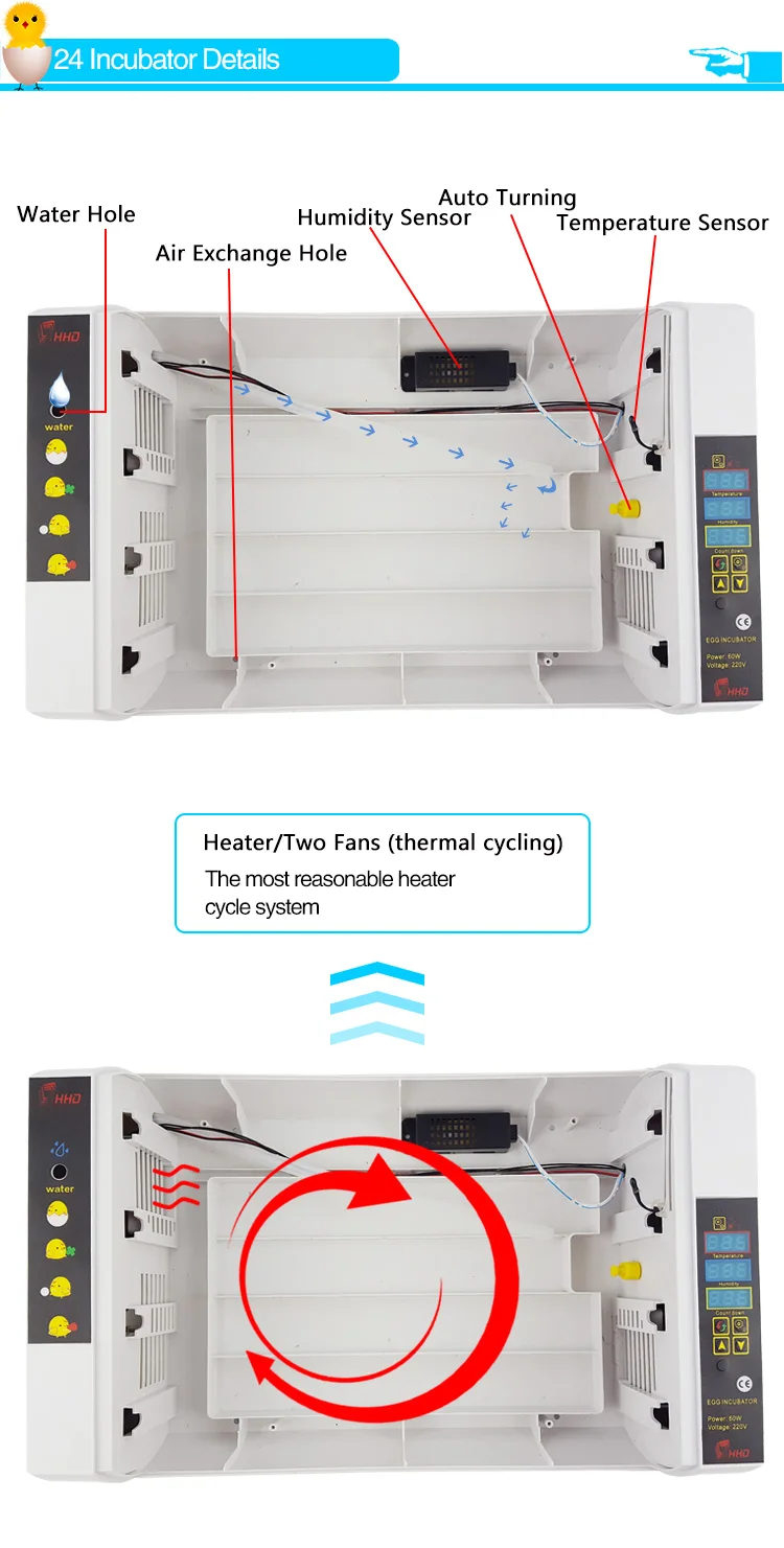 Egg Incubator, Chicken Egg Incubator, Automatic Egg Incubator manufacturer / supplier in China, offering Hhd Latest Model 24 Eggs Chicken Egg Incubator Yz24A, Cheap Price Ce Approved 13 Chicken Egg Hatchery Machine, Hhd Two in One Hhd Hot 1232 Poultry Egg Incubator Price in Nepal and so on. Before using an incubator to hatch eggs, sterilize the incubator with a diluted bleach solution, plug it in, and add warm water to the humidity pan At least 24 hours before incubating eggs, calibrate the temperature of the incubator, to make sure it will stay stable Let the fertile eggs come to room temperature, then place them in the incubator. Egg Incubator Bedienungsanleitung Deutsch Vergleich worauf man achten muss Wenn es um die eigenen Vorstellungen und Wünsche geht, ist es sehr wichtig, dass Sie das Budget für den Kauf Ihres Lieblingprodukgs von Anfang an festlegen.