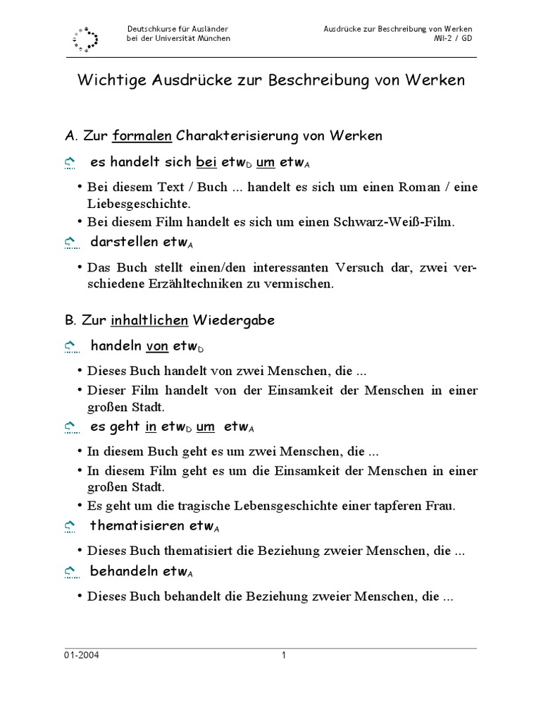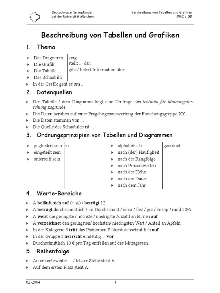 Deutschkurse für Ausländer bei der Universität München Beschreibung von Tabellen und Grafiken MII2 / GD Den ersten Platz belegt A Die zweite Stelle nimmt B ein Dann / Danach folgt C mit einem Wert von 12 Das Schlusslicht bildet Z 6 Entwicklungen ↗ ↘ ansteigen zunehmen s erhöhen s vermehren sinken abnehmen s vermindern. Seit mehr als 50 Jahren führt der Verein mit dem schönen Namen Deutschkurse für Ausländer bei der Universität München (DkfA) Deutschkurse für ausländische Studenten durch Business German and General German in Munich Deutsch für Beruf, Alltag und Freizeit in München. Es gibt Deutschkurse, die Sie auf die Arbeit in einem bestimmten Berufsfeld vorbereiten In diesen berufsbezogenen Deutschkursen lernen Sie zum Beispiel Fachbegriffe oder Ausdrücke, etwa für die Pflegebranche oder das Handwerk Darüber hinaus gibt es Deutschkurse, die speziell auf einzelne Berufe zugeschnitten sind Deutsch, das Sie grundsätzlich im Arbeitsalltag brauchen, können Sie in.