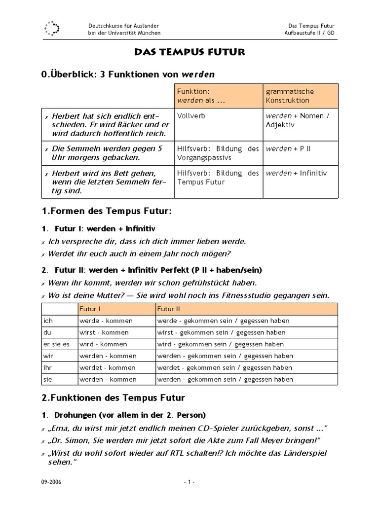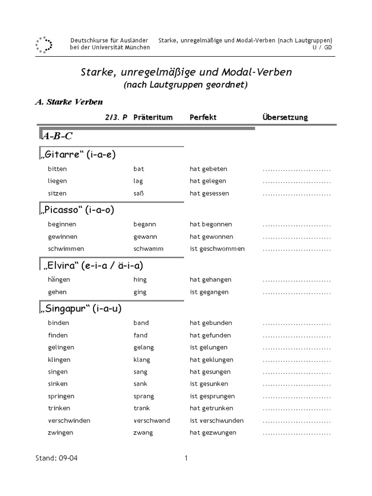 Folgende Anbieter für Deutschkurse werden vom „Beirat Qualitätssicherung für studienvorbereitende und studienbegleitende Deutschausbildung an der LMU“ empfohlen Deutschkurse bei der Universität München eV (DKFA) Agnesstraße 27, München 49 (0) 244 10 490. Das Institut für Deutsch als Fremdsprache der LMU bietet seinen deutschen und internationalen Studierenden eigenständige sprach und literaturwissenschaftliche BA und MAStudiengänge sowie Promotionsmöglichkeiten an Zudem partizipiert das Institut an interdisziplinären Studiengängen. Deutschkurse für Ausländer bei der Universität München Starke und unregelmäßige Verben (nach Lautgruppen) MI1 / GD Starke und unregelmäßige Verben (nach Lautgruppen geordnet) A Starke Verben 2/3 P Präteritum Perfekt Übersetzung ABC „Gitarre“ (iae) bitten bat hat gebeten.