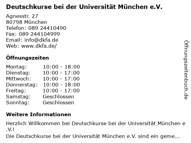 Deutschkurse bei der Universität München eV aus München SchwabingWest ist in der Branche Sprachschulen tätig Jetzt mit Adresse ☎ Tel Kartenansicht. Seit mehr als 50 Jahren führt der Verein mit dem schönen Namen „Deutschkurse für Ausländer bei der Universität München“ (DkfA) Deutschkurse für ausländische Studenten durch Und natürlich werden dort auch die Deutschprüfungen für die Uni TestDaF und DSH angeboten. Sprachkurse Deutschkurse für Ausländer bei der Universität München eV Deutsch Uni online (DUO) Leute kennenlernen Freunde finden Tablesurfer Dinner Community für Studenten;.