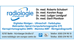 Radiologie am EuropaCenter Nürnberger Straße 67 D Berlin Tel 030 Fax 030 Sprechzeiten Montag, Dienstag, Donnerstag 800 bis 1900 Uhr Mittwoch 800 bis 1400 Uhr Freitag 800 bis 1500 Uhr und nach Vereinbarung Privat und alle Kassen.