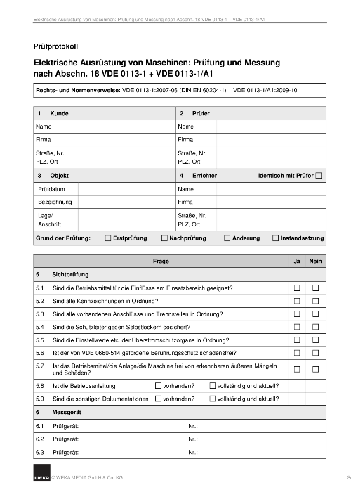 Prufprotokoll Fur Die Elektrische Ausrustung Von Maschinen Prufung Und Messung Nach Abschn 18 Vde 0113 1