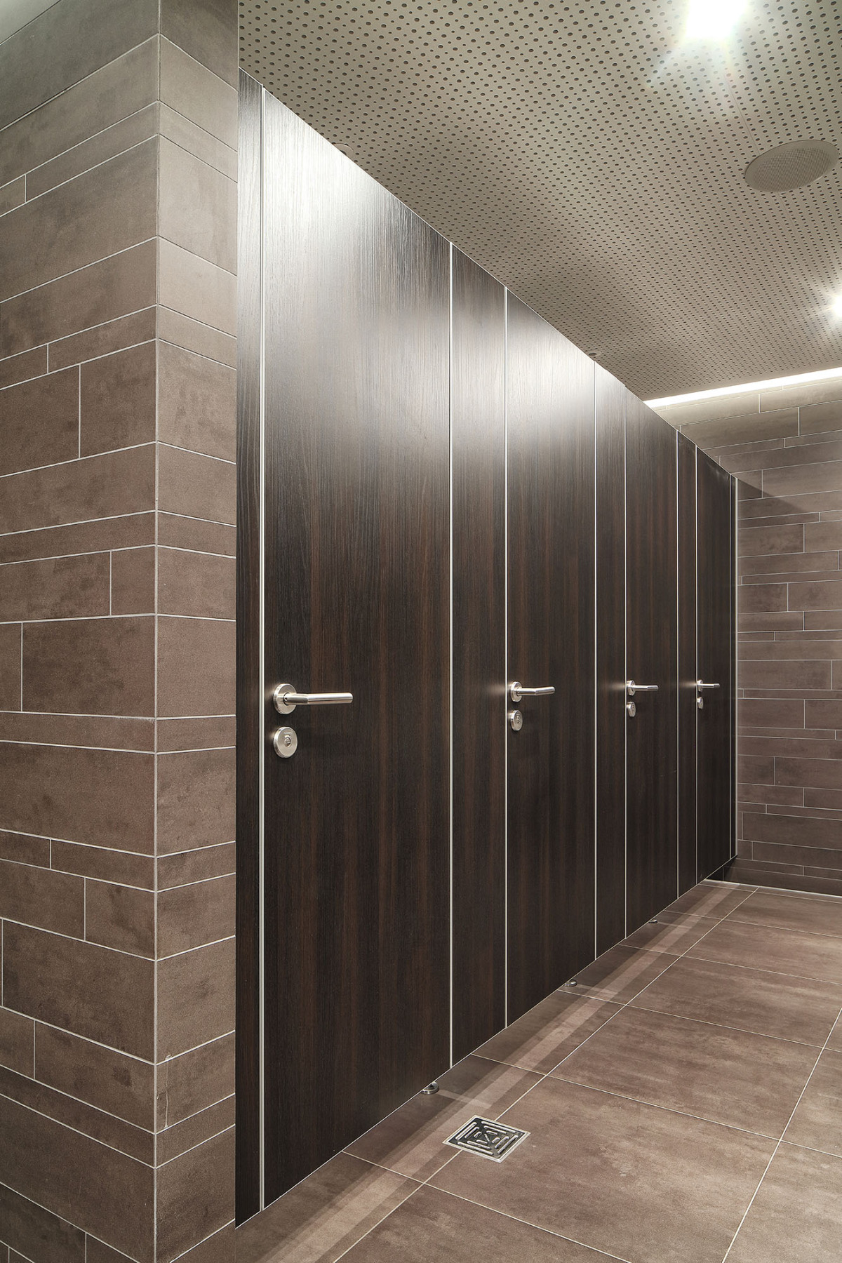 Wc Kabinen C Basic Von Kemmlit Turfarbe Graphit Und Vorderwandteile In Holzdekor Von Fundermax Locker Storage Decor Storage