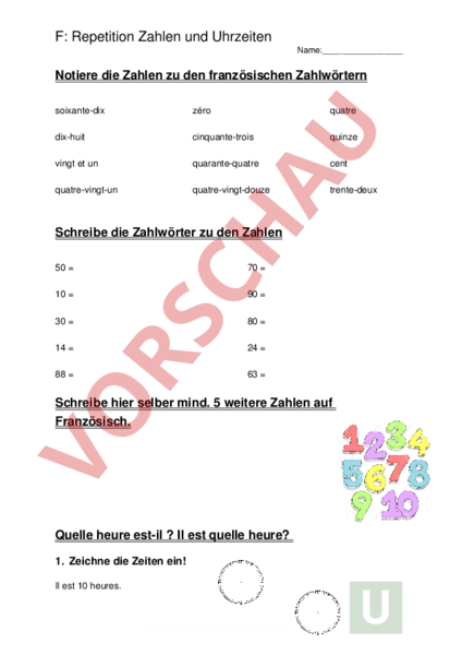 Arbeitsblatt Zahlen Und Uhrzeiten Franzosisch Wortschatz