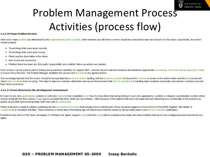 The problem management process is described in ITIL’s Service Operation document The document describes problem management as the process by which the lifecycle of all problems is managed The main benefits of problem management are improved service quality and reliability. ITIL Intermediate OSA Problem Management Tutorial Welcome to lesson 5 ‘Problem Management’ of the ITIL Intermediate OSA Tutorial, which is a part of the ITIL Intermediate OSA Certification Course This lesson is all about Problem Management and its features Let us begin with the objectives of this lesson. Are at least some problem management activities established in the organization, eg problem determination, problem analysis, problem resolution?.