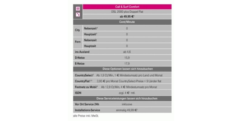If you order THome's allinclusive package (THome Call & Surf Paket) this month, you can get a 50€ bonus If you choose their entertainment package (THome Entertain) you can get an HD Digital Recorder free of charge for one year Additionally if you change your internet provider to THome, you will get a 140€ bonus. WiFi capable 7 1/2" l x 4 1/2" w x 1/2" thick 12 GHZ quadcore processor;. Das Telekom Call & Surf Comfort Plus Paket ist der umfangreichste Telekom Call & Surf Doppel Flatrate Tarif und ideal für anspruchsvolle Privatkunden sowie für Selbstständige und Freiberufler (Homeoffice).