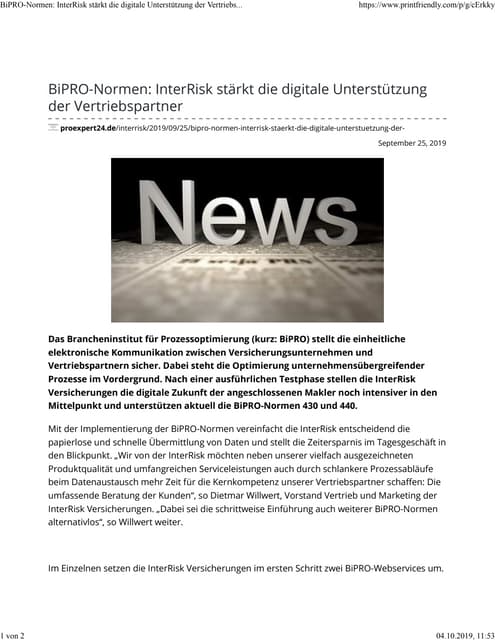 Mit dem digitalen Postkorb (BiPRO Norm 430) erhalten Sie als Makler Ihre gesamte GothaerMaklerpost in elektronischer Form Jetzt informieren. BiPRO eV ist ein gemeinnütziger Verein und finanziert sich durch die Mitgliedsbeiträge der Vereinsmitglieder Dieses sind Versicherungsunternehmen und Hersteller von Maklerverwaltungsprogrammen Eine der wichtigsten Normen ist die 430er Reihe, die ein gesellschaftsübergreifendes Postfach definiert. BiPro ELITE is the legacy product you’ve come to know and trust and joining the BiPro family are BiPro BOLD and BiPro RENEW With this, we hope to better serve our variety of customers and help them all to meet their health and wellness goals.