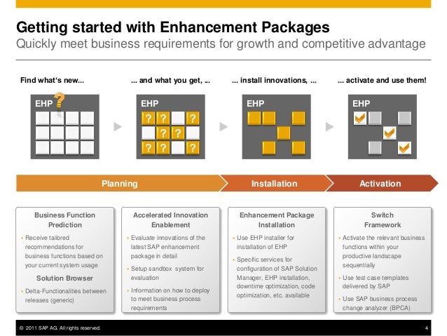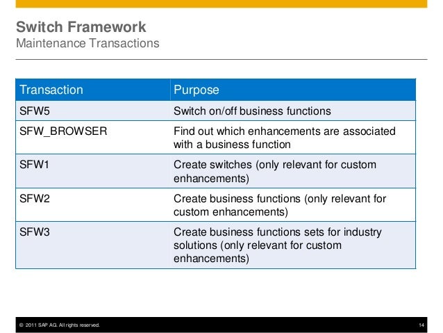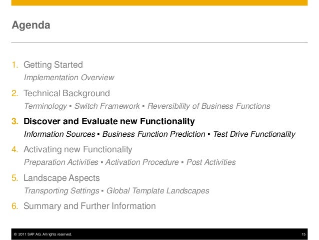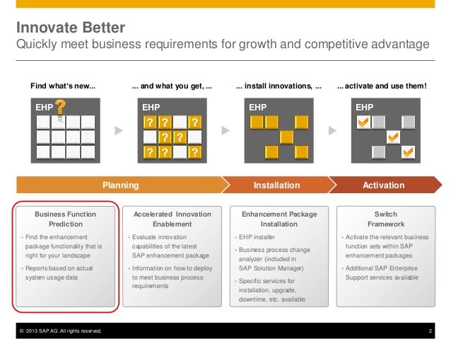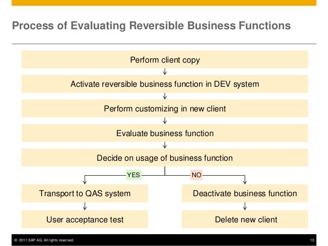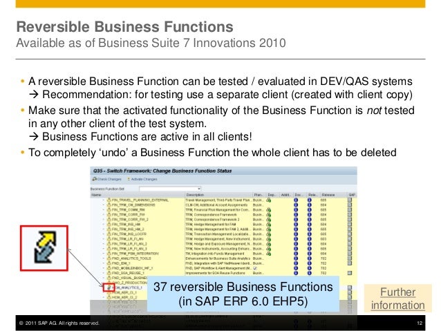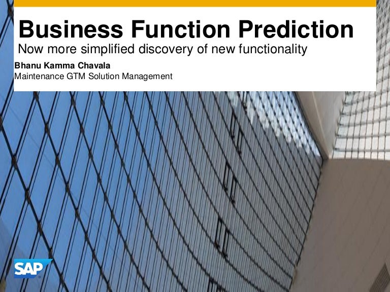 Sap business function. When you activate new SAP Business Functions, millions of lines of new SAP code are automatically activated This is likely to introduce unexpected changes to your existing business processes and even failures in your custom code And this is a challenge faced by thousands of businesses Recently conducted research revealed that SAP Enhancement. For activating a new Business Function, user can perform the following steps below 1) Create a backup of your system Generally, it is impossible to revert the changes made by the activation of the Switch 2) Log on to the development system with your SAP_ALL authorization 3) Disabling all the. The business function predictor and its content are provided by SAP AG and its affiliated companies ("SAP Group") for informational purposes only, without representation or warranty of any kind, and SAP Group shall not be liable for errors or omissions with respect to the materials.