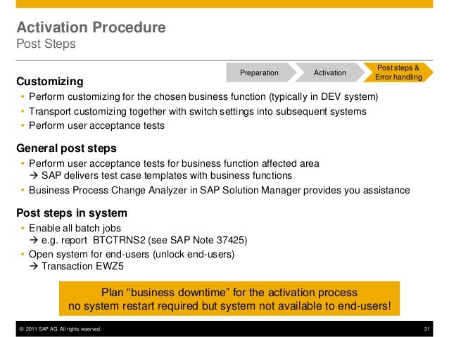 Please read the information given in the notes corresponding to the customer industry Further information about "Deactivating Business Functions" can be found in SAP Online help Deactivating Business Functions Check additionally KBA. Set up users and user authorizations to functions and data;. When you activate business functions in transaction SFW5 in the development system, system does not pop up a screen to ask you to add the change into a transport request So you have no idea how to transport the activation into other systems.