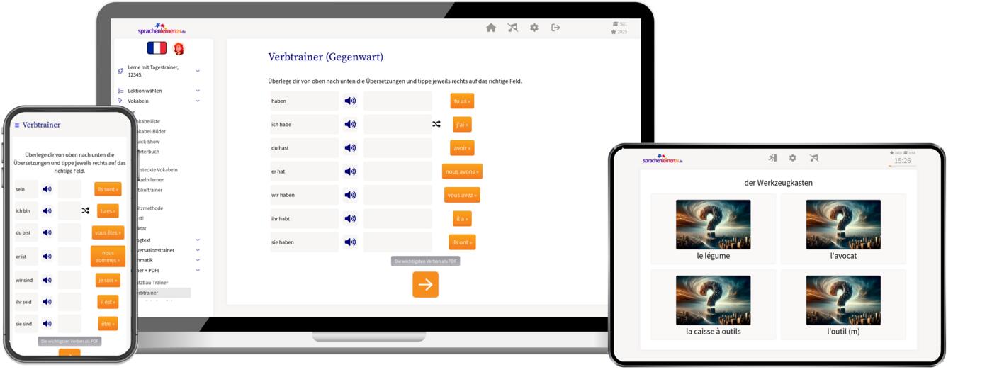 Einfach Französisch lernen für Anfänger!. Französisch Vokabeln lernen mit unserem Vokabeltrainer als Android App oder iPhone App Den gesamten Wortschatz von 50LANGUAGES "Französisch" findest Du auch in unseren kostenlosen Apps als praktischen Vokabeltrainer für unterwegs Du kannst alle Vokabeln kostenlos und beliebig oft lernen und wiederholen. Französisch Vokabeltrainer Französisch lernen mit dem kostenlosen Französisch Vokabeltrainer Wähle die richtige Übersetzung und vergrößere deinen Französisch Wortschatz Die Sprache wird weltweit von 115 Millionen als Muttersprache und von bis zu 105 Millionen Millionen als Zweitsprache gesprochen.